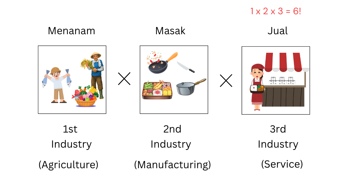 Inilah yang disebut “6th Industry” (六次産業化), hasil kombinasi: