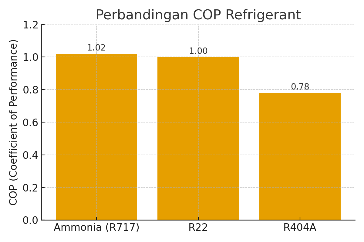 Ammonia punya COP (Coefficient of Performance) lebih tinggi, artinya pendinginan lebih besar dengan konsumsi energi lebih rendah.