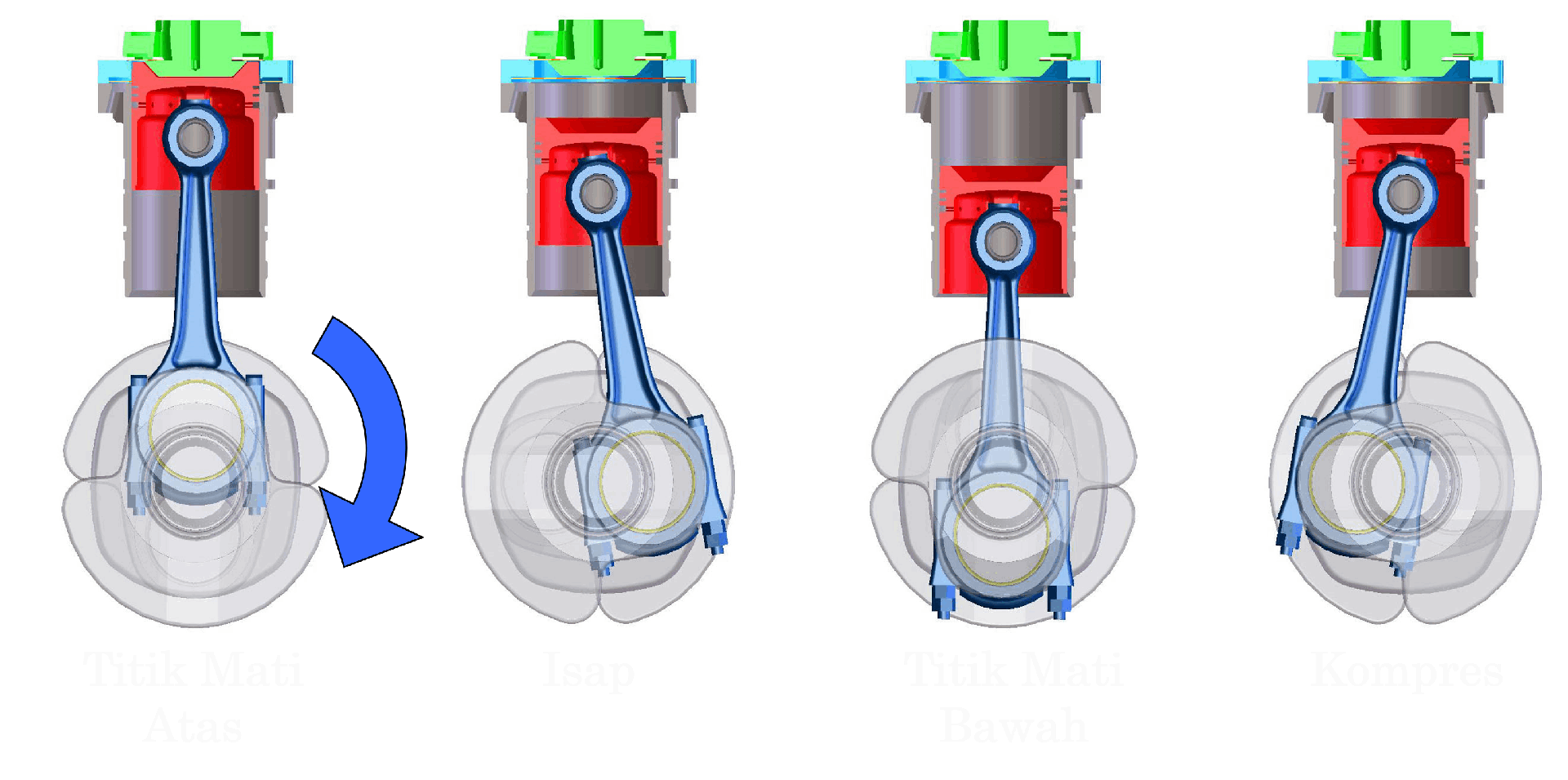 - Proses Kompresi & Buang → piston naik, gas tertekan lalu keluar.